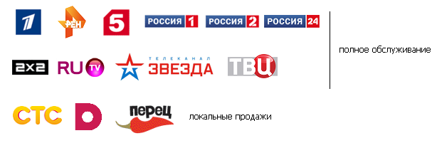 Региональные рекламные блоки на федеральных каналах, около 10 крупнейших локальных каналов, 150 городов